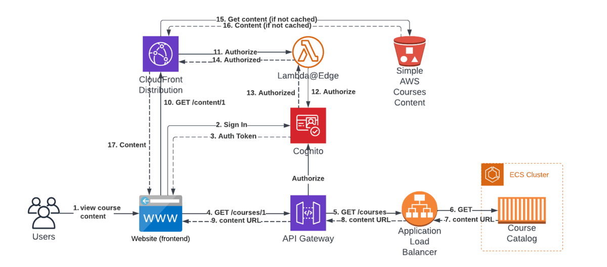 We have three microservices: Course Catalog, Content Delivery, and Progress Tracking. The Content Delivery service is responsible for providing access to course materials such as videos, quizzes, and assignments. These files are stored in Amazon S3, but they are currently publicly accessible. We need to secure access to these files so that only authenticated users of our app can access them.