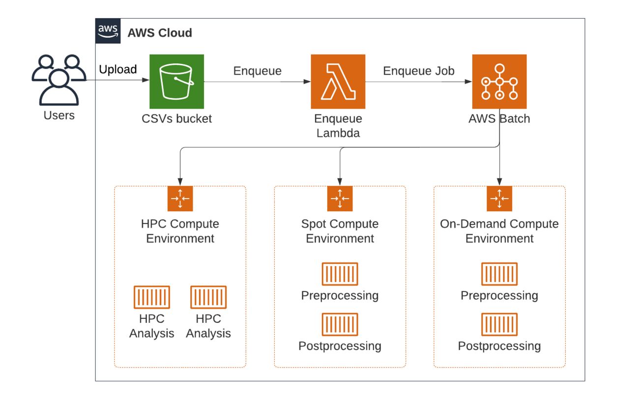 ComputeEnvironmentOrder) and the Spot environment as a secondary. When a job enters this queue, AWS Batch first attempts to run it on On-Demand. If that environment is fully utilized or hits its max vCPU limit, it the job will spill over to the Spot environment if it's marked as “Spot-friendly.”HPC Queue: Dedicated for multi-node GPU-based tasks. This queue is mapped only to the HPC environment.