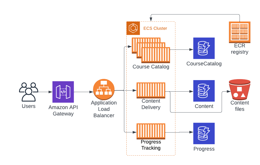 Let's see microservices in a real example. Picture the following scenario: We have an online learning platform built as a monolithic application, which enables users to browse and enroll in a variety of courses, access course materials such as videos, quizzes, and assignments, and track their progress throughout the courses. The application is deployed on Amazon ECS as a single service that's scalable and highly available.